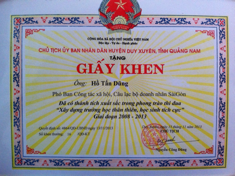 Ghi nhận sự đóng góp nhiều năm qua của anh cho sự nghiệp giáo dục của quê hương, Ủy ban nhân dân xã Duy Trinh tặng Giấy khen cho anh vì đã có thành tích đóng góp cho sự nghiệp phát triển  giáo dục xã Duy Trinh  giai đoạn 2007-2012 và trong năm 2013 vừa qua anh được Ủy Ban nhân dân Huyện Duy Xuyên vinh danh khen tặng anh là một trong những mạnh thường quân có nhiều đóng góp xuất sắc cho sự nghiệp Giáo dục của Huyện Duy Xuyên trong phong trào “Xây dựng trường học thân thiện, học sinh tích cực” giai đoạn 2008-2013, vào dịp Lễ tổng kết tuyên dương khen thưởng  các tổ chức cá nhân có thành tích xuất sắc năm 2013.